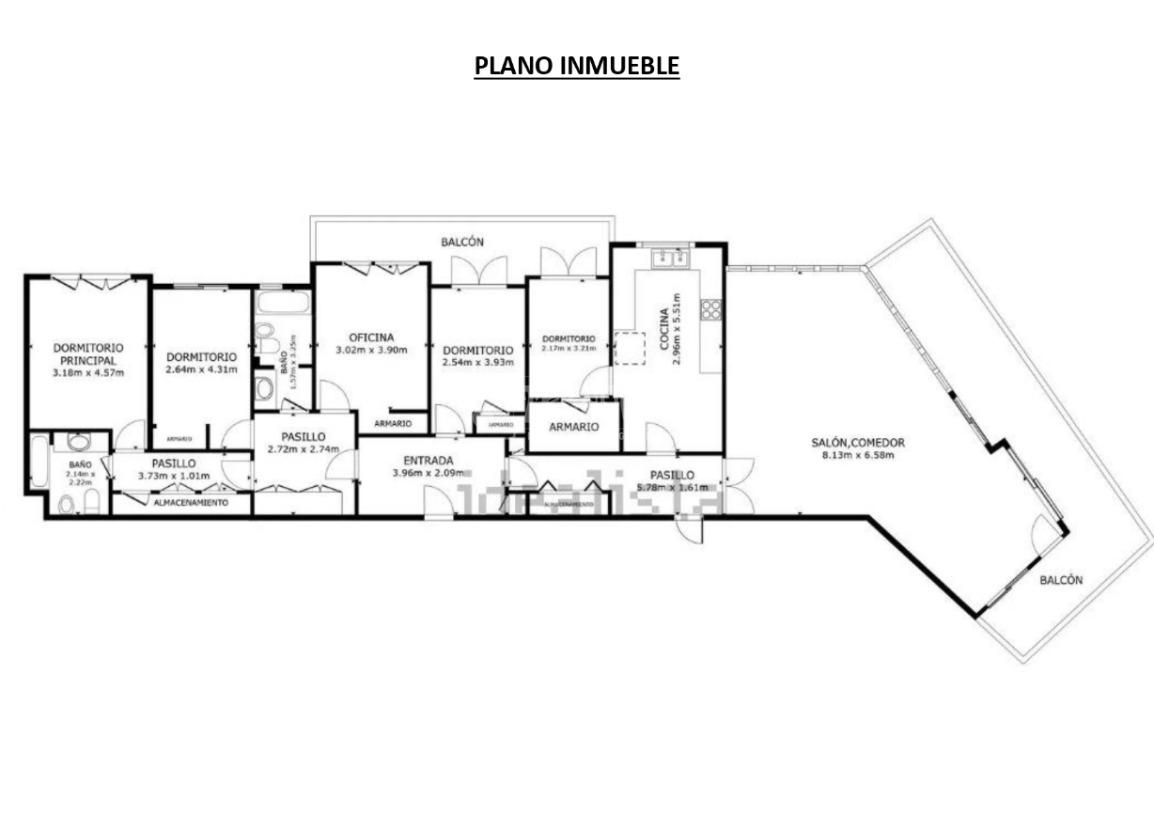 La zona de noche alberga cinco dormitorios dobles, destacando la suite principal con baño privado, además de un segundo baño completo que da servicio al resto de estancias. La clara separación entre áreas refuerza la sensación de privacidad y confort.